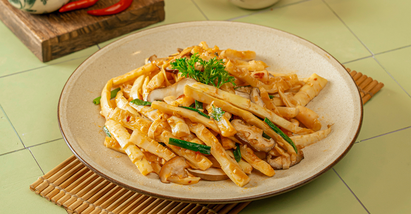 Nếu bạn muốn một món khai vị thanh mát, tốt cho sức khỏe, bổ dưỡng lại lạ miệng thì hãy ăn thử măng trúc xào nấm của nhà Bò Tơ Quán Mộc.