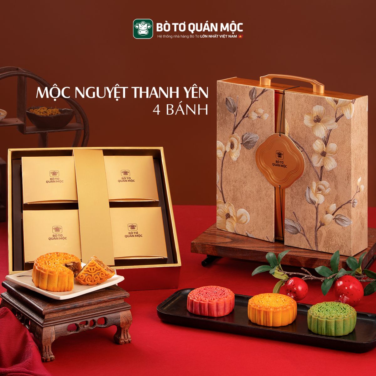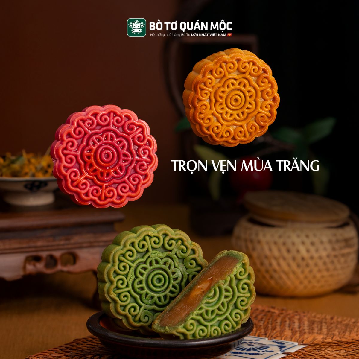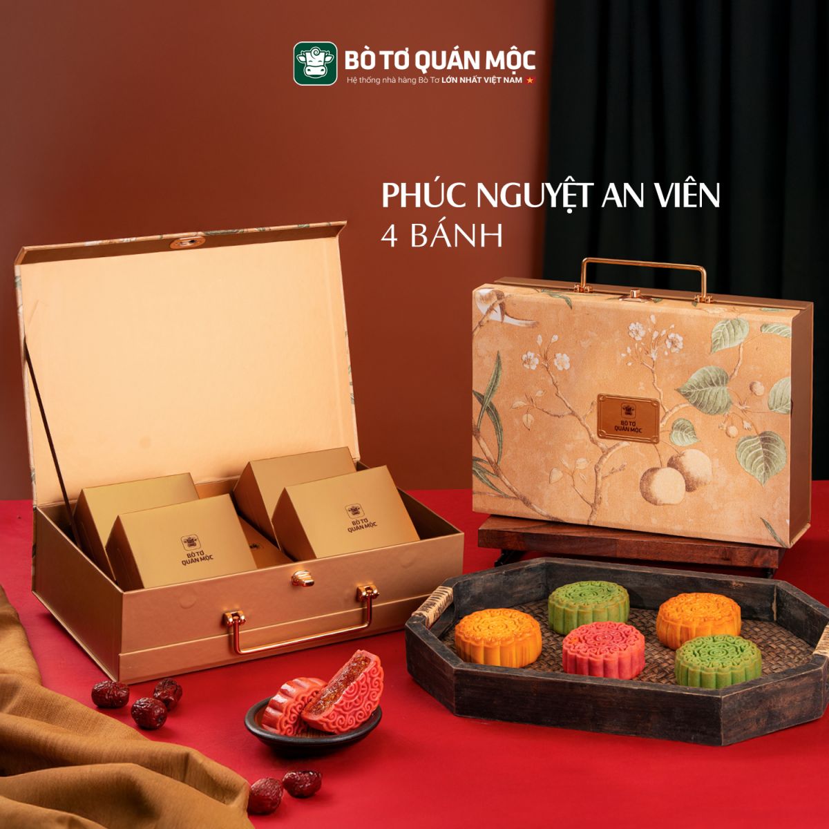 Bộ sưu tập bánh Trung Thu Bò Tơ Quán Mộc được đặt trong hai phiên bản: Mộc Nguyệt Thanh Yên mộc mạc, ấm áp và Phúc Nguyệt An Viên sang trọng, ấn tượng. Mỗi thiết kế bánh Trung Thu Bò Tơ Quán Mộc đều là một lời chúc riêng, gói trọn tâm tình người trao, hứa hẹn sẽ là món quà ý nghĩa để bạn gửi đến gia đình, cấp trên và đối tác.